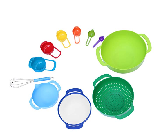 Set incorporates 11 pieces: 4.8 qt (10.5-inch) enormous blending bowl, 3.2 qt (9-inch) colander, 1.75 qt (7.5-inch) nylon sifter strainer, 0.52 qt (6-inch) little blending bowl with estimations inside, 1 cup, 1/2 cup, 80ml, 60ml,15ml estimating cups,1 tablespoon and 1 egg whisk